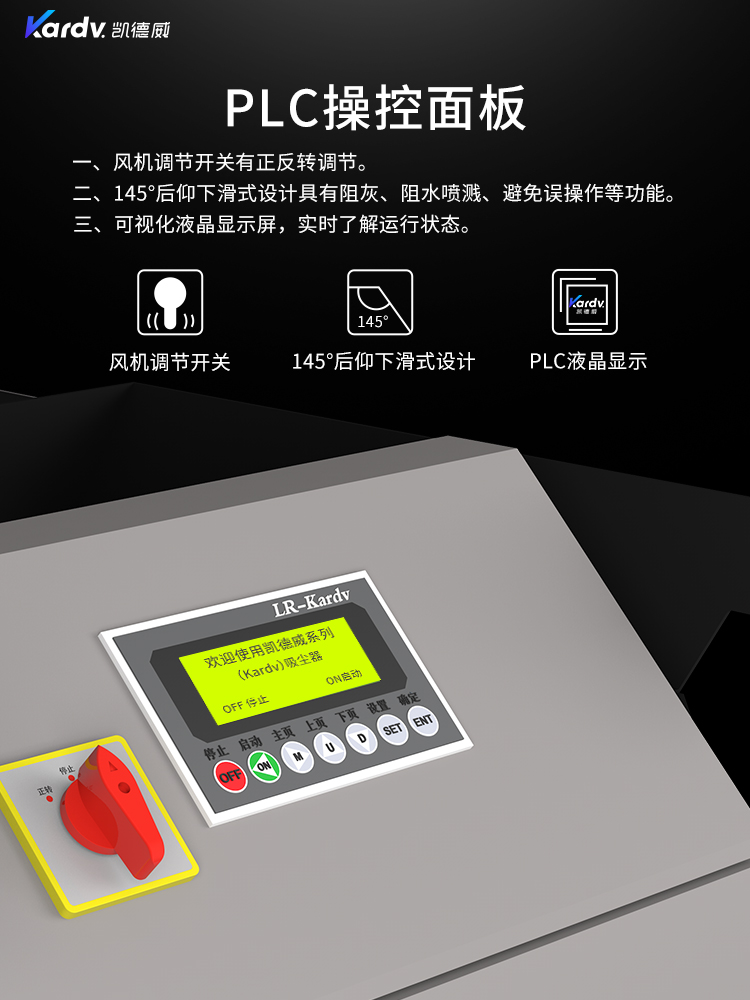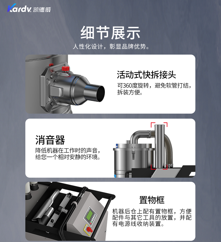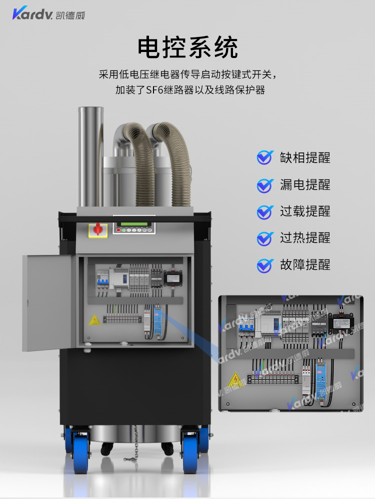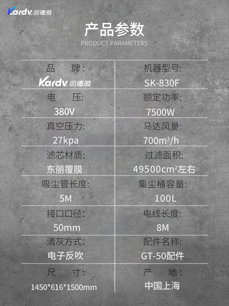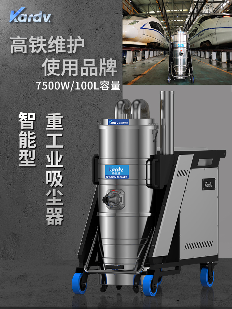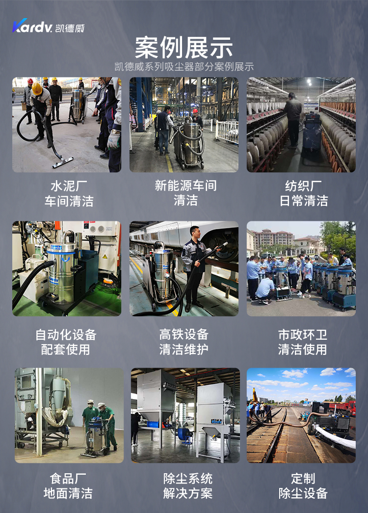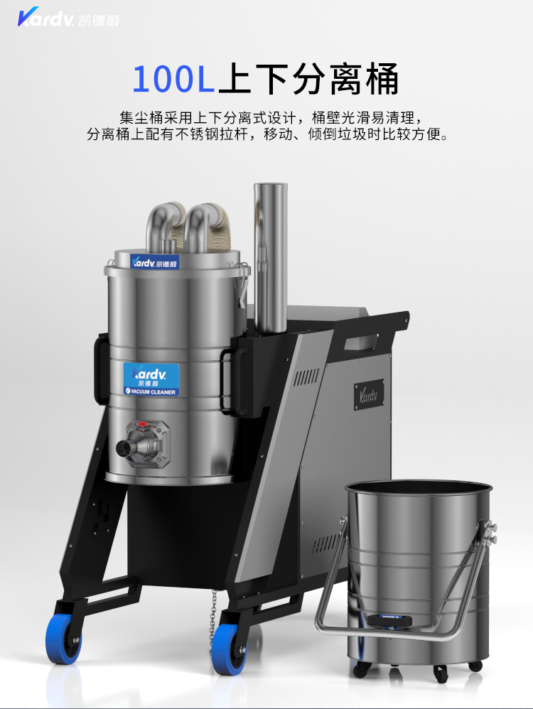 SK - F系列是我司自主研發的智能型工業吸塵器。具有以下六大亮點: A.整機采用工業設計風格,外形剛勁有力,做工精良美觀。 B.集塵桶固定把手設計。C.采用直徑160mm的TPE靜音前后大輪 D.電控系統采用凱德威自主設計帶有液晶顯示屏的智能PLC電控控制系統 E.動力源采用凱德威FY系列定制主機,并選用NSK耐高溫防塵軸承。 F.全自動電子反吹清灰系統具有人工免保養,吸力強勁、穩定,故障率低。 G.集塵系統采用100L不銹鋼材質的上下分離桶,桶壁光滑易清理。