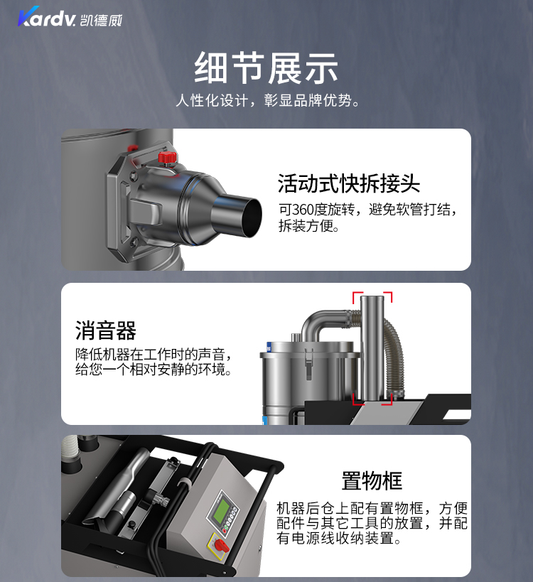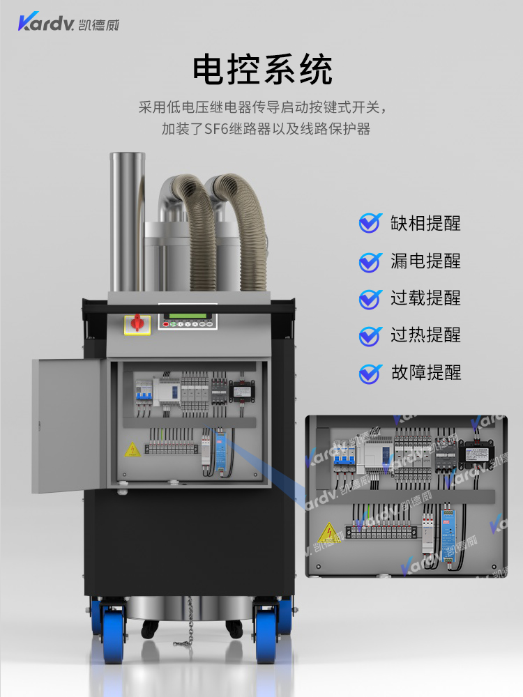 SK - F系列是我司自主研發(fā)的智能型工業(yè)吸塵器。具有以下六大亮點(diǎn): A.整機(jī)采用工業(yè)設(shè)計(jì)風(fēng)格,外形剛勁有力,做工精良美觀(guān)。 B.集塵桶固定把手設(shè)計(jì)。C.采用直徑160mm的TPE靜音前后大輪 D.電控系統(tǒng)采用凱德威自主設(shè)計(jì)帶有液晶顯示屏的智能PLC電控控制系統(tǒng) E.動(dòng)力源采用凱德威FY系列定制主機(jī),并選用NSK耐高溫防塵軸承。 F.全自動(dòng)電子反吹清灰系統(tǒng)具有人工免保養(yǎng),吸力強(qiáng)勁、穩(wěn)定,故障率低。 G.集塵系統(tǒng)采用100L不銹鋼材質(zhì)的上下分離桶,桶壁光滑易清理。