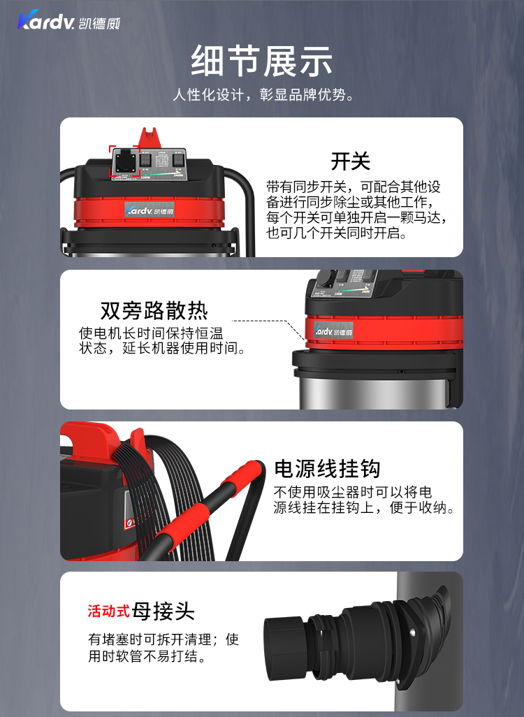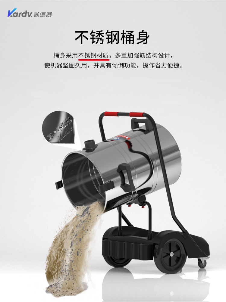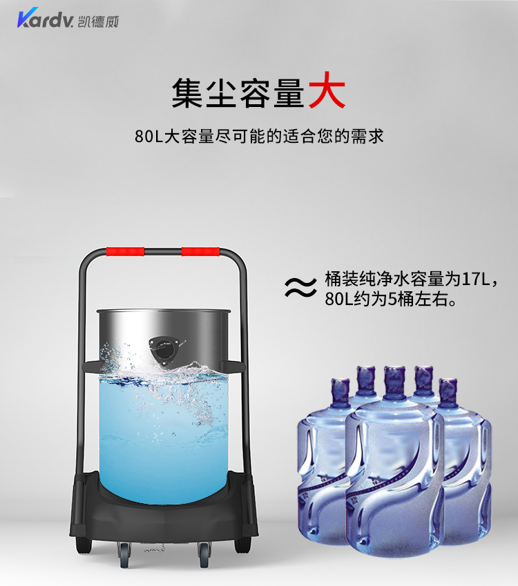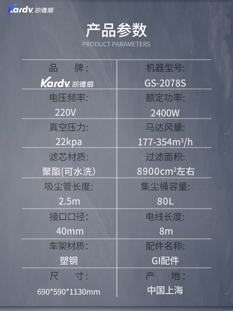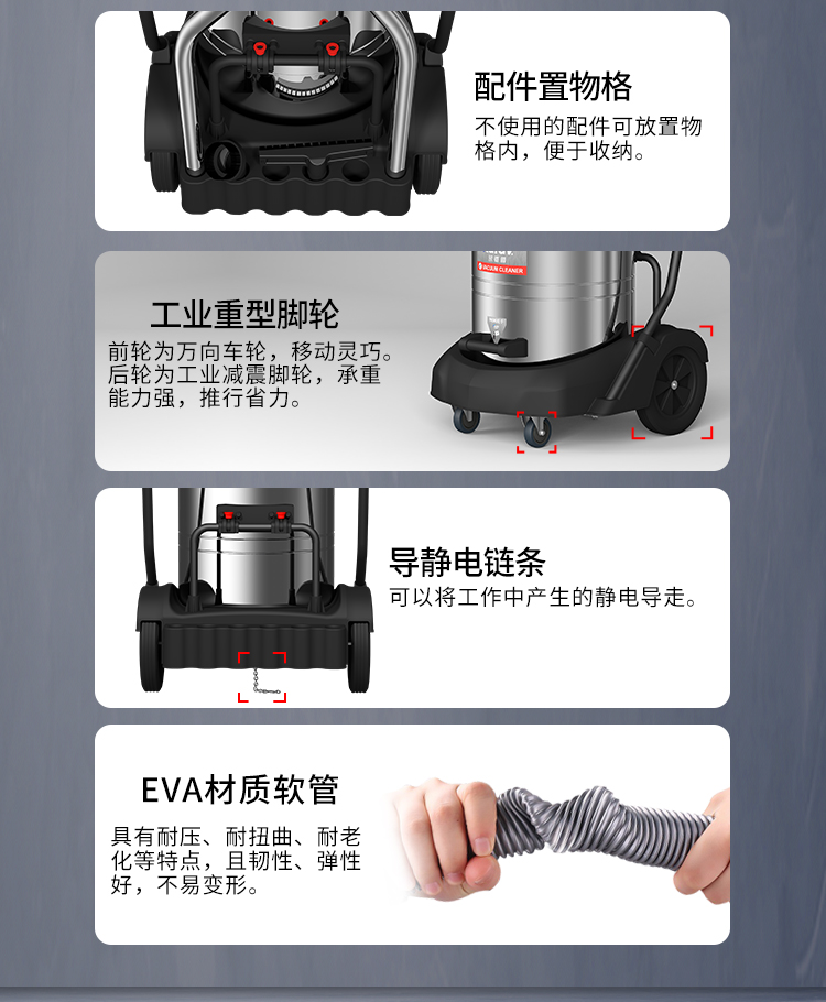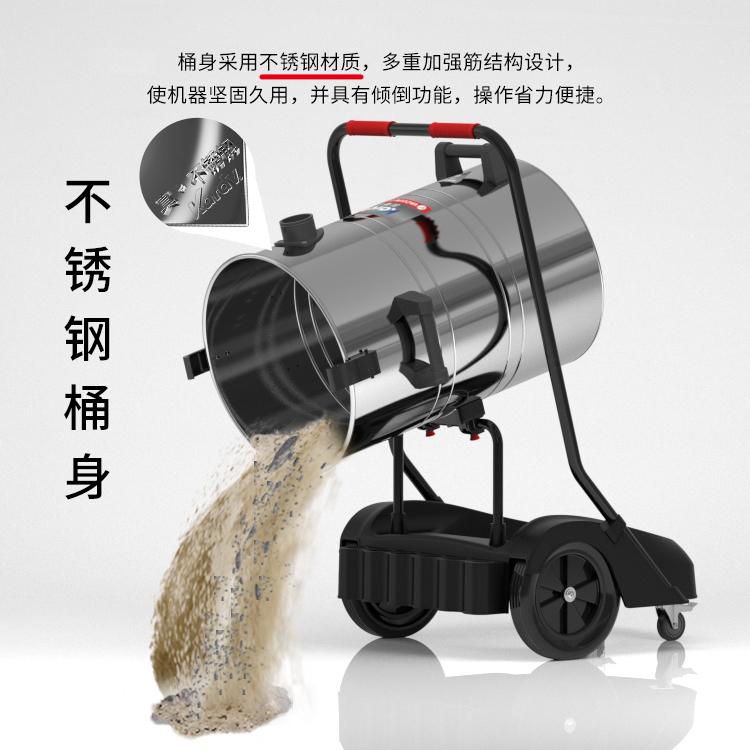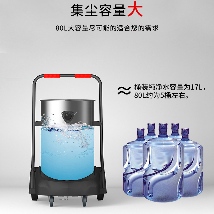 GS-2078S是一款工業型吸塵器,集塵桶為80L,為不銹鋼材質,配有車架,在移動時輕巧方便,車架底座為PP材質,底座上有置物格,可放置配件或工具方便收納和使用;可以用在工廠、倉庫或建筑工地等場所清理灰塵等,在商業環境中也可以使用。