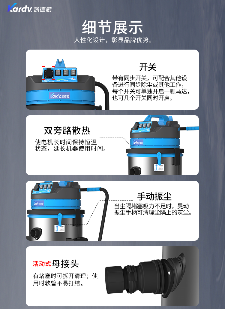 DL-3078S是一款工商業吸塵器,有3顆馬達,可單獨或聯合開啟;集塵桶為80L,為不銹鋼材質,配有車架,在移動時輕巧方便,車架底座為PP材質,底座上有置物格,可放置配件或工具方便收納和使用;配有手動晃動振塵,在使用的過程中,左右晃動振塵手柄就可以起到清理過濾器的作用;可以用在工廠、倉庫或建筑工地等場所清理灰塵等,在商業環境中也可以使用。