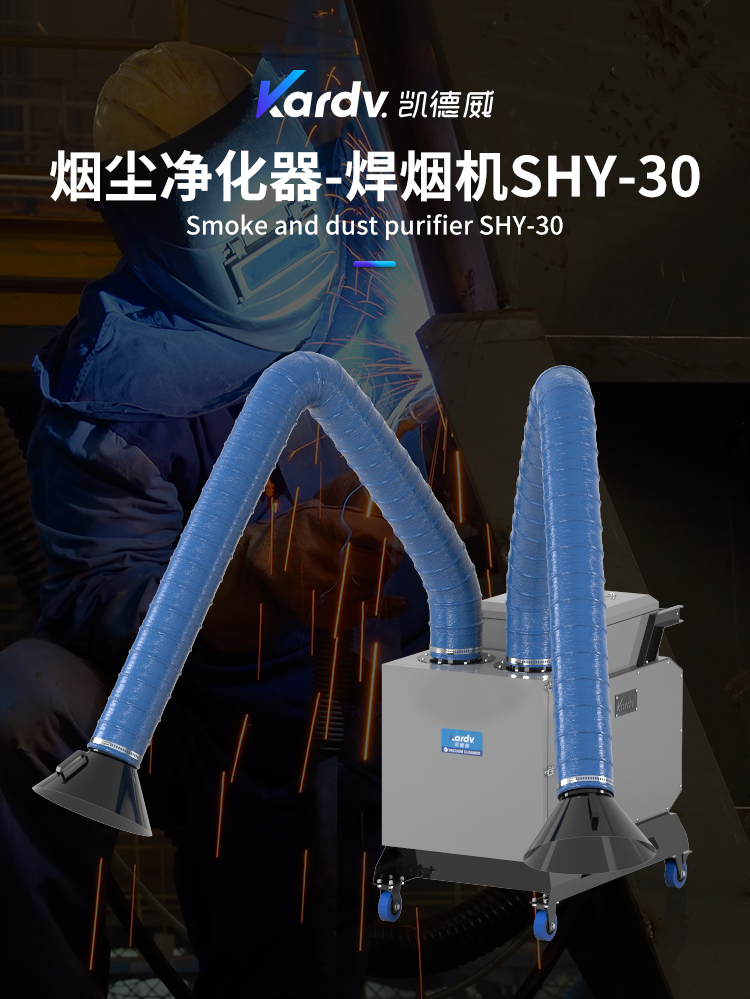 金屬焊接、激光切割、打磨作業時,大量煙塵懸浮在車間內,被吸入人體肺部影響身體健康,因此在焊接煙塵進入焊工呼吸區前把這些煙塵進行凈化處理。凱德威移動式焊接煙塵凈化器是一款治理焊接、切割、打磨時,產生在空氣中大量懸浮危害人體的細小煙塵顆粒而設計的凈化裝置,可移動式單機處理或多工位系統集中式處理。配有1根2.5米長的吸氣臂,在不同的工作地點移動靈活,操作方便。